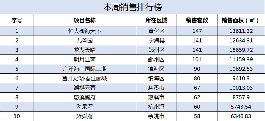 宁波上周成交套数TOP10榜单中慈溪市占3席,鄞州区、镇海区、奉化区各占2席,余姚市占1席;恒大御海天下成交147套位列第一,龙湖天曜成交141套排名第二,绿城·明月江南成交101套排名第三。