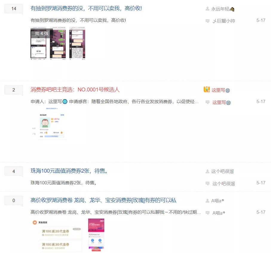 “有抽到罗湖消费券的没,高价收”、“无限收珠海消费券,7折,有的朋友速度加我”、“抢了一张288减50的券,现20出”……