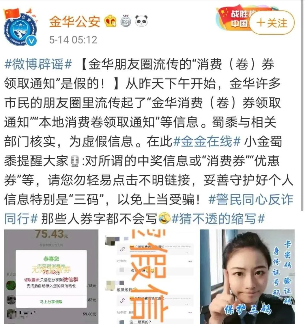 5月14日,金华公安在官方微博辟谣称,金华朋友圈流传的消费券领取通知经核实是虚假信息,提醒大家对所谓的中奖信息或消费券、优惠券等,勿轻点不明链接,妥善保护个人信息特别是“三码”,以免上当受骗。