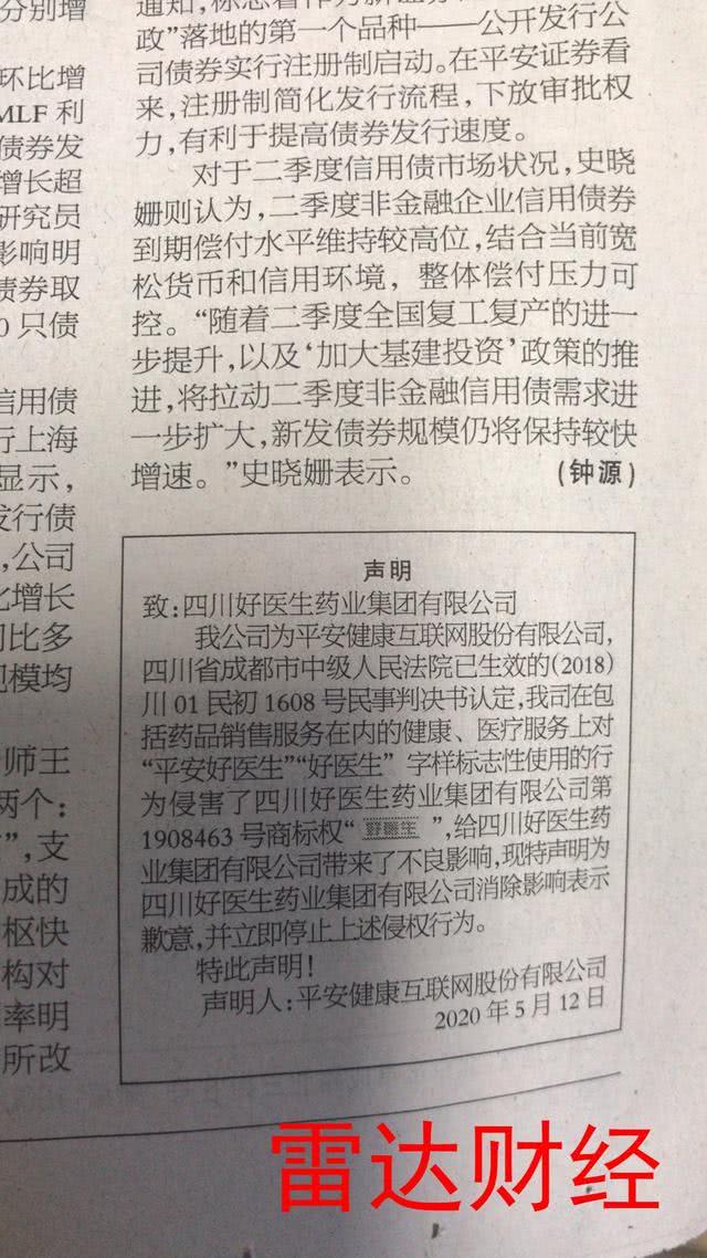 5月12日,平安健康在《中国消费者报》发布声明称,已经生效的民事判决书认为,平安健康在包括药品销售服务销售服务在内的健康、医疗服务商对"平安好医生"、"好医生"字样标志性使用的行为侵犯了四川好医生1908463号商标权"好医生",给四川好医生带来了不良影响。现特此声明为四川好医生消除影响并表示歉意,并立即停止上述侵权行为。