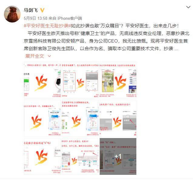 "平安好医生推出号称'健康卫士'的产品,无底线违反商业伦理,恶意抄袭北京雪扬科技有限公司安顿产品,身为公司CEO,我无比愤慨。" 今年5月9日,北京雪扬科技有限公司CEO马剑飞在微博发文称,平安好医生首席创新官陈卫俊团队,以合作为名、骗取公司重要技术文件。