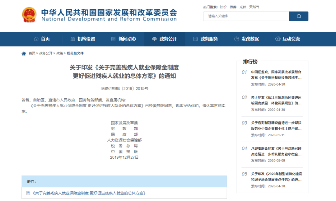 ▲ 发改委等六部门印发《关于完善残疾人就业保证金制度更好促进残疾人就业的总体方案》(发改价格规〔2019〕2015号),明确自2020年1月1日起:对在职职工人数30人(含)以下的企业,暂免征收残保金。 发改委
