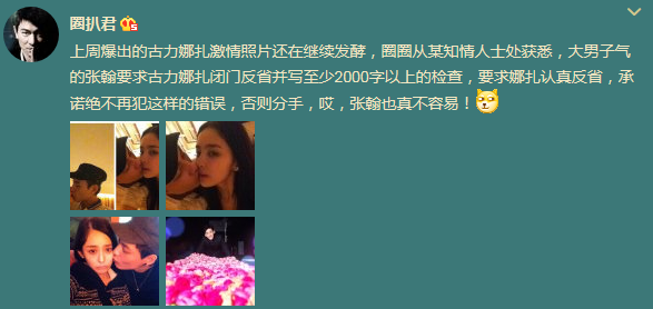 娜扎被爆激吻照 被张翰要求写2000字以上检讨