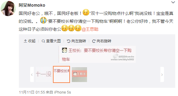 该女主播在微博中发文称“国民好老公,哦不,国民好老板!‘双十一没购物点什么啊’我说没钱!宝宝是真的没钱……‘要不要校长帮你清空一下购物车’啊啊啊!老公你好帅,我不管今天这种日子必须叫你老公。”