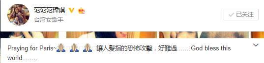 她所属福茂唱片回应:“范范每天都会如常的晒照,希望带给社会疗愈正面的功效,也很关心巴黎的恐怖攻击,希望大家不要恶意误解她。”