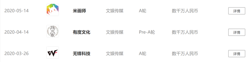 当然,哔哩哔哩的主要投资领域仍然为文娱传媒,据IT桔子数据显示,前者曾投资过42家文娱传媒类公司。自2020年初至今,哔哩哔哩便投资了无锋科技、有度文化以及米画师三家公司。