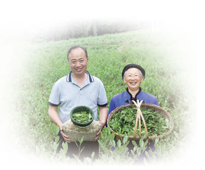 重庆黔江区中塘镇双石村驻村第一书记王运洪(左)和村民展示所种植的茶叶。