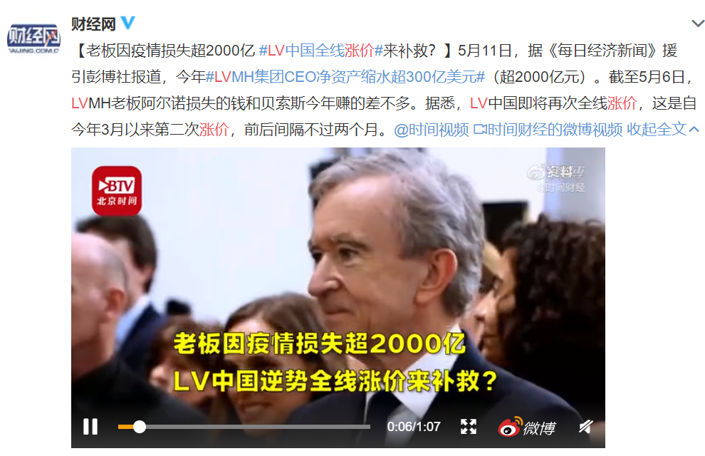 “欧洲最有钱的男人,贝尔纳·阿尔诺,在新冠危机下损失了300亿美元,比世界上任何一个人都多!”