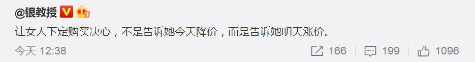 让女人下定购买决心,不是告诉他今天降价,而是告诉她明天涨价。