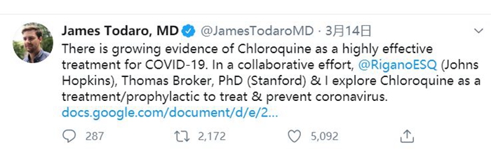 当天,区块链投资人托达罗(James Todaro)在Twitter发文称,有越来越多的证据显示氯喹对治疗新冠病毒“非常有效”。推文还附上了一份上传到谷歌文档的治疗研究报告。