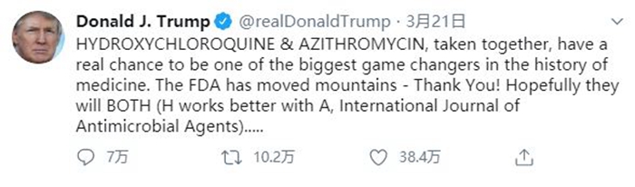 之后的21日,特朗普直接在Twitter发文推广,称羟氯喹配合阿奇霉素使用,将成为医药史上的“最大的游戏规则改变者”。