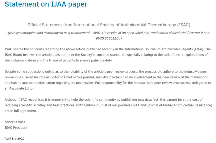 由于试验存在诸多问题,《国际抗菌药物期刊》于4月3日发表声明,警告该研究不符合期刊的标准,特别是在试验对象的选择标准上缺乏合理解释。