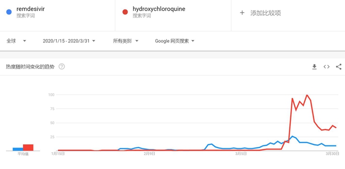 谷歌趋势显示,到3月中旬之前,全球用户对瑞德西韦的关注一直高于羟氯喹。3月中旬之后,羟氯喹的搜索量陡增。