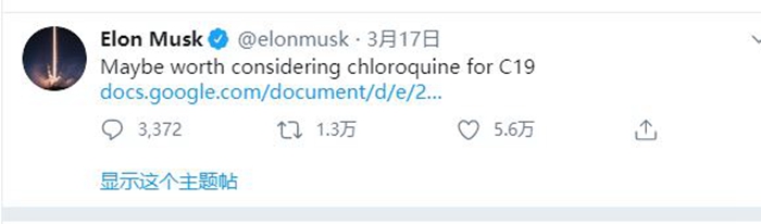 马斯克在Twitter上转发了托达罗等人的报告,写道:“可能值得考虑用氯喹治疗新冠病毒。”