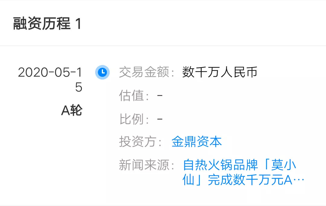 天眼查信息显示,自热火锅品牌“莫小仙”已于5月15日完成数千万元A轮融资。