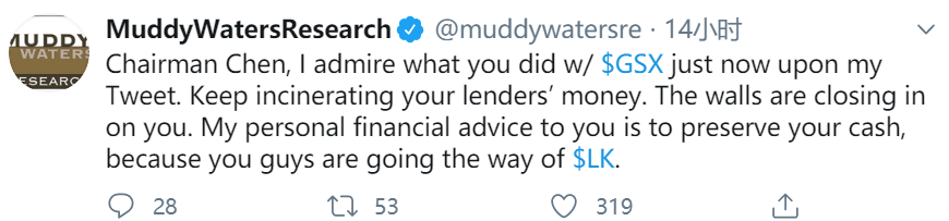 对于跟谁学的反击,浑水则继续回应。该机构于5月19日晚间在推特上表示,他们会披露更多证据。同时,浑水喊话跟谁学创始人陈向东:“陈董,我钦佩你敢于回应的勇气。继续烧光投资者的钱,南墙就在前方。建议你存好个人现金,因为下场就是瑞幸。”