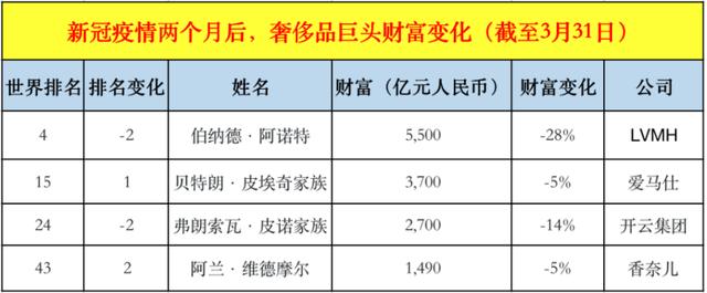 相比而言,爱马仕、香奈儿的掌门人损失最小。据胡润研究院数据显示,从1月末到3月末,爱马仕的皮埃奇家族和香奈儿的维德摩尔财富损失均为5%。