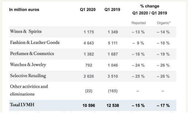 据了解,LVMH集团2020年一季度业绩下滑严重,总营收同比下滑17%,为近10年来首次下跌。