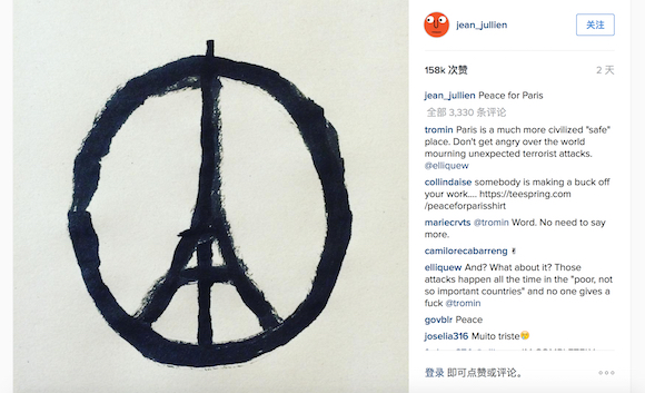 设计了这个图标的是现居美国纽约的法国插画设计师Jean Jullien。在此次恐怖袭击事件发生没多久,这位30岁出头的设计师就把一幅手绘的图片上传到了自己的Instagram主页上,并配上了“Pray for Paris(为巴黎祈祷)”的文字说明。到记者发稿时,这张照片已收获了近16万个点赞,3300多条回复,并在全球范围内得到了病毒式的传播。
