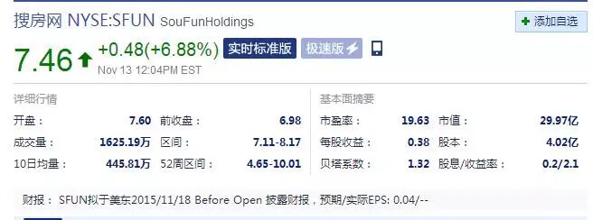 附图:11月14,搜房宣布一分为二回归A股后中国时间1:06分股价大涨6.88%。