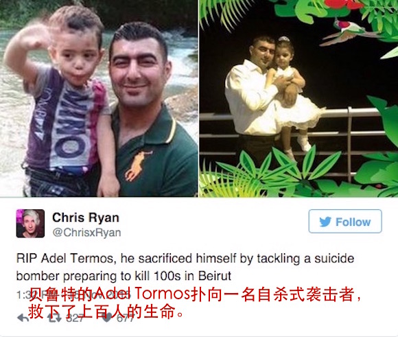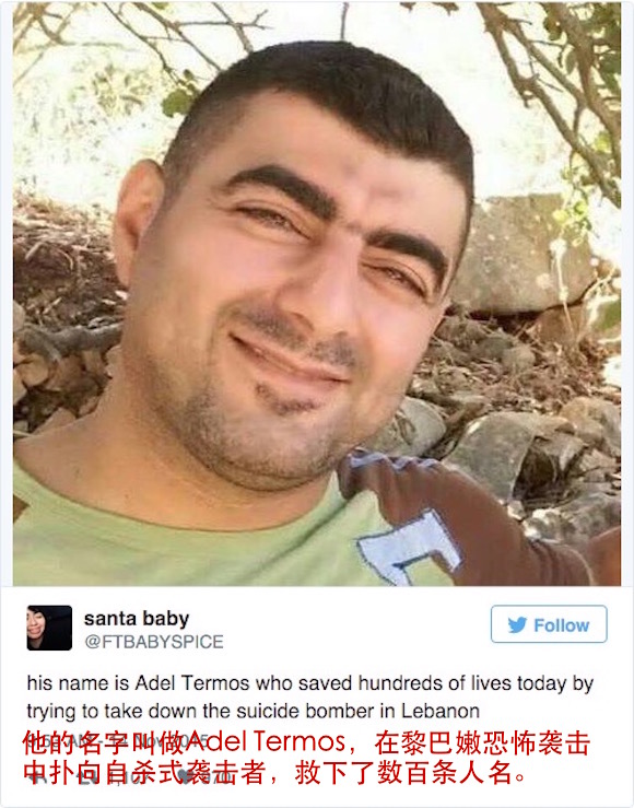 当地博主Elie Fares告诉PRI,他看到炸弹在人群远处爆炸了,无数人躲过了一劫,而Adel Tormos却和恐怖分子一道,被炸得粉身碎骨……