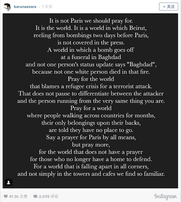 为巴黎祈祷,但请祈祷更多,为那些已经没有家园可以守护却无人为之祈祷的人们。为每个角落都在坍塌的世界,而不是只为我们熟悉的铁塔和咖啡厅。”