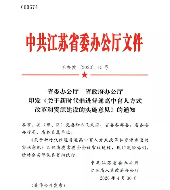 此外近日,江苏省委、省政府发布了《关于新时代推进普通高中育人方式改革和资源建设的实施意见》,其中规定:
