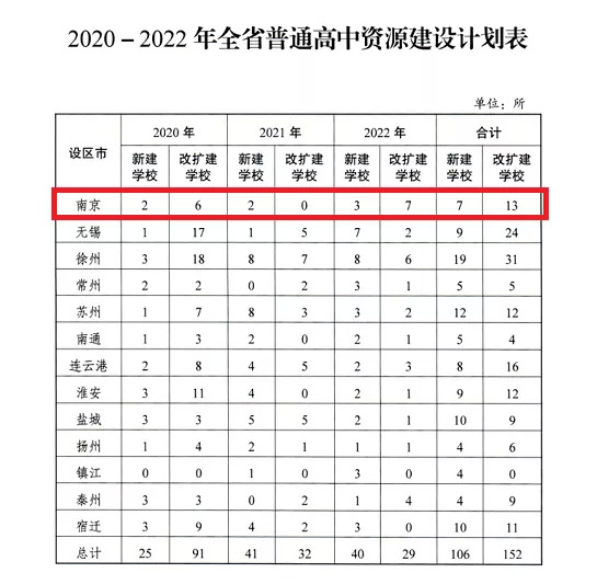 其中南京新建高中7所,改扩建13所,高中将再次扩招。