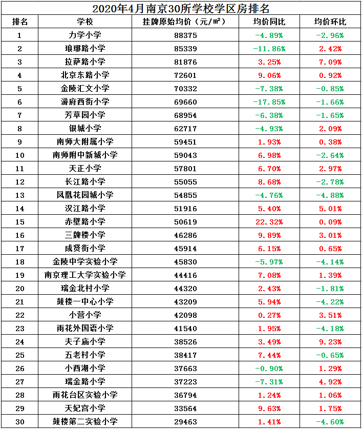 2020年4月南京30所名校学区房均价48515元/㎡,环比2020年3月下跌了375元/㎡。其中,力学小学学区房卖的最贵,挂牌均价达到88375元/㎡。