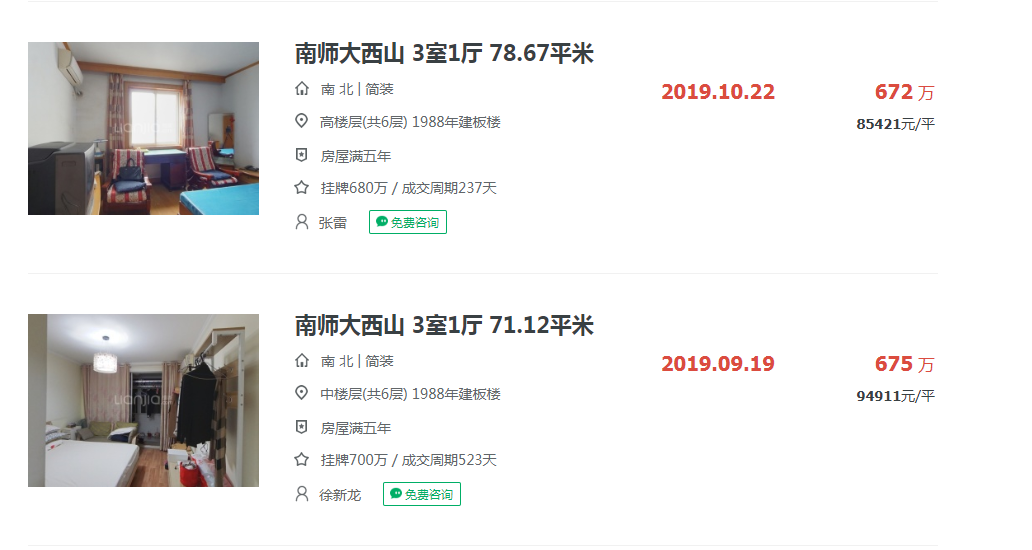 在链家网上,可以看到,总价都在六七百万左右,均价在9-10万/㎡。注意这些房源信息都已经是5个月、7个月以及一年前发布的了。再看看小区成交的二手房,成交单价在8.5-9.4万/㎡,成交周期在8个月及1年多。