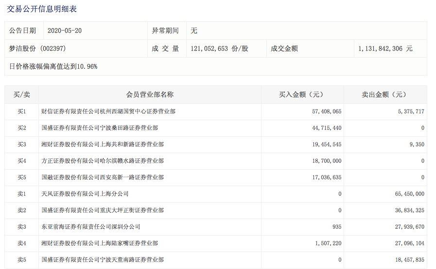 连续多日的涨停,梦洁股份在5月12日、5月14日、5月18日、5月20日登录深交所龙虎榜。5月15日-5月18日,梦洁股份异常期间价格涨幅偏离值累计达到20.53%,其中,天风证券股份有限公司上海分公司合计买入5305万元,位列买入榜第一。