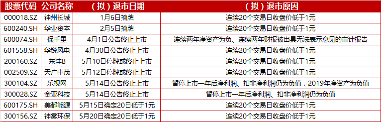 据界面新闻统计,今年刚过去近5个月,就已有多达10家国内上市公司摘牌、(拟)终止上市,这一数字接近2019年全年数量(12家公司),力度可谓空前。其中7家都是由于面值退市,相较其他条款漫长的退市周期而言,面值退市更加市场化以及高效率。