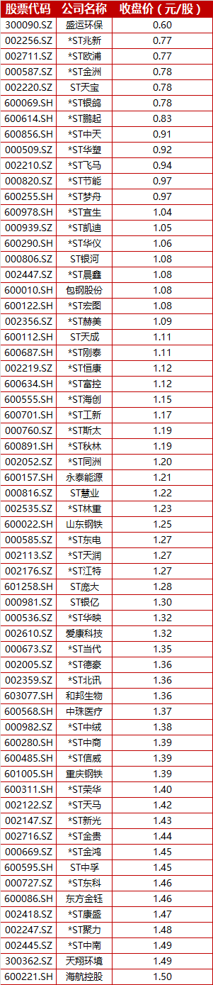 据界面新闻统计,截至5月20日收盘,剔除已确定退市的上市公司,有多达62家公司的股价低于1.5元/股,中间不乏海航控股等知名企业。其中有12家已经低于1元/股,处于面值退市的边缘。特别是ST天宝(002220.SZ)、盛运环保(300090.SZ)均已连续12个交易日收盘价低于1元,需要注意退市风险。