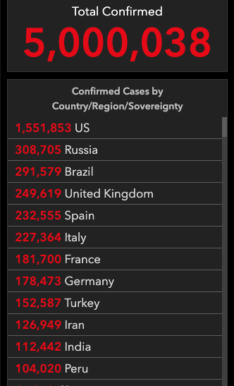 据约翰斯·霍普金斯大学统计,截至北京时间5月21日13点32分,全球新冠肺炎累计确诊病例已突破500万,达到5000038例,累计死亡病例328169例。