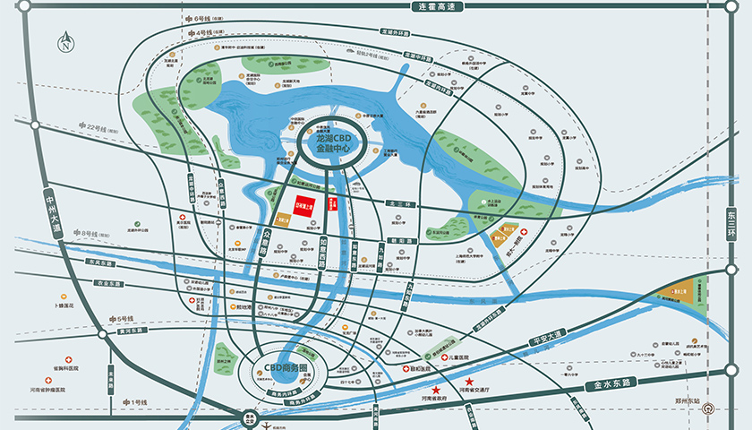 正商·祯瑞上境北望未来国家中部金融中心——龙湖金融岛,南望郑东如意湖畔CBD商务中心区,正处于两大CBD的中轴核心区位。同时,项目西望凤山公园,北依8400亩龙湖水域,西运河、如意运河左右环抱,三湾叠抱。