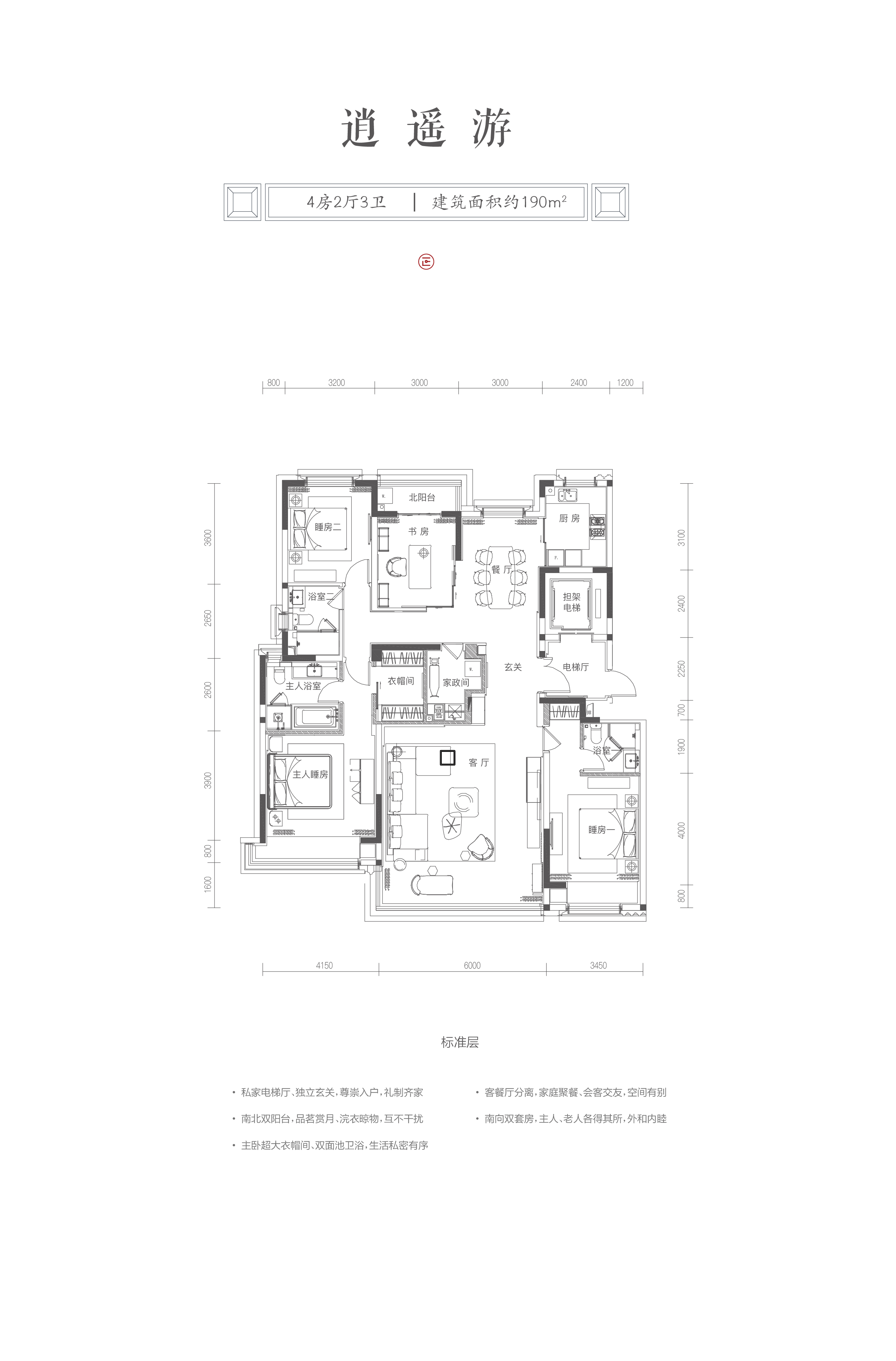 以190㎡主力户型为例,四室两厅三卫,户型方正,三套房配置,所有空间全明设计,动线合理,动静分离,公共活动区与个人休息区、玄关、家政间等空间一应俱全,这些构成了一个豪宅最基本的素养。
