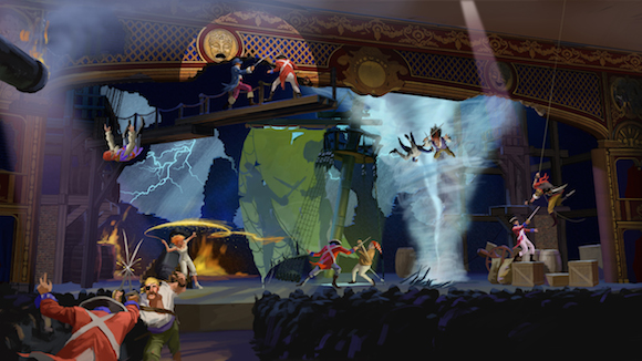 作为“宝藏湾”最大型的游乐设施,“加勒比海盗——沉落宝藏之战”则是关于杰克船长的故事。在这个项目的设定中,游客们会变成海盗加入杰克船长的冒险队,最终目的是要去探寻戴维·琼斯船长藏在深海的宝藏。在这个过程中,游客会坐上一只可以容纳30人的小木筏,穿过两只海盗舰队的交战区域。在这个项目中,迪士尼运用了3块巨型多媒体穹顶、投影效果以及复杂的光影和声音系统、机器人模拟技术来还原海战的情景。乘客所坐的海盗船则能够旋转、移动并敏捷地根据船体位置触发动作与相应场景音效。