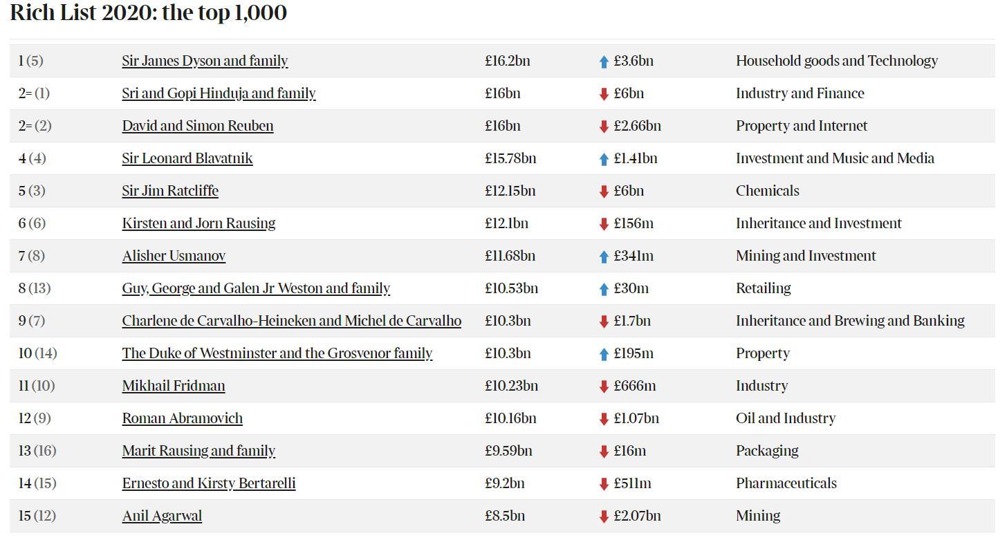 《星期日泰晤士报》近日公布了“2020年富豪榜”(Rich List 2020),评选出了1000名英国富豪。