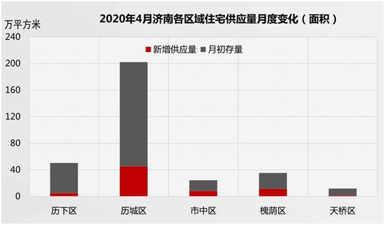 从各区域供应来看,市场新增量主要来源于历城区,在本月中共有5个新项目入市,16个在售项目推出新房源,共计新增住宅3883套,新增供应面积45.3万平方米,环比上月新增套数增长27.1%,新增面积上涨31.9%。槐荫区在4月份共有7个项目推出新房源,共计新增住宅944套,新增供应面积11.4万平方米。其余区域新增量均不足10万平方米。