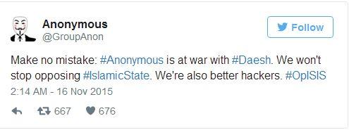 法国恐怖袭击发生后,国际黑客组织“匿名者”(Anonymous)在视频中对ISIS宣战,誓言将对网上圣战组织的每一个支持者穷追猛打。