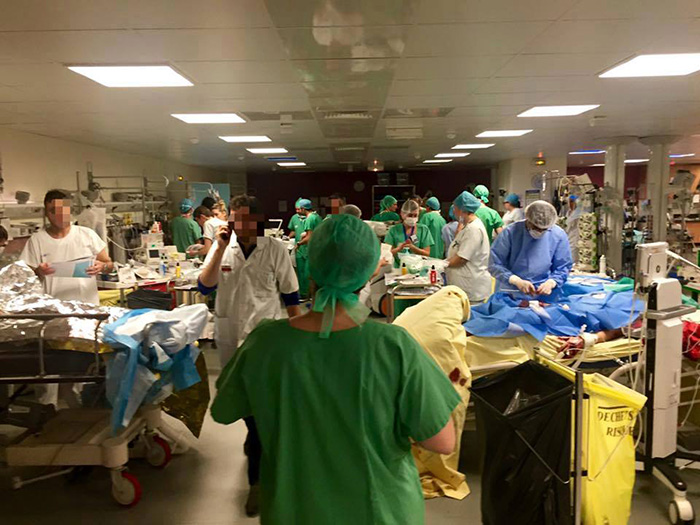 图中,巴黎医院的医务人员在爆炸当晚进行紧张的抢救。