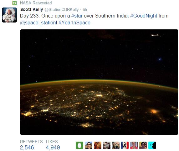 第三个瞬间有些与众不同,这是NASA在袭击发生后转发的一张照片,宇航员Scott Kelly从太空传来地球的鸟瞰图,图片中,一颗星在南印度上空升起。