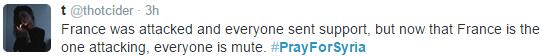 巴黎恐怖袭击发生后,今天凌晨,法国发动了对ISIS最大规模空袭 ,共向叙利亚境内目标投掷了20枚炸弹。法国向ISIS宣战后,twitter上一个名为“为叙利亚祈祷”的话题迅速成为热门,很多网友为叙利亚境内的无辜平民而担心。