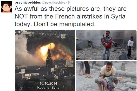 这些推文的配图触目惊心,孩子在战火中哭泣,城市在轰炸中湮灭,很多人想当然的认为这就是法国空袭叙利亚后造成的平民伤亡。