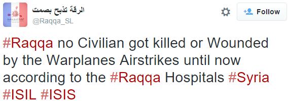 一个叙利亚当地反ISIS的twitter账号表示,被袭城市拉卡医院目前尚未接到平民伤员,意味着尚未发现有平民在空袭中遇害。