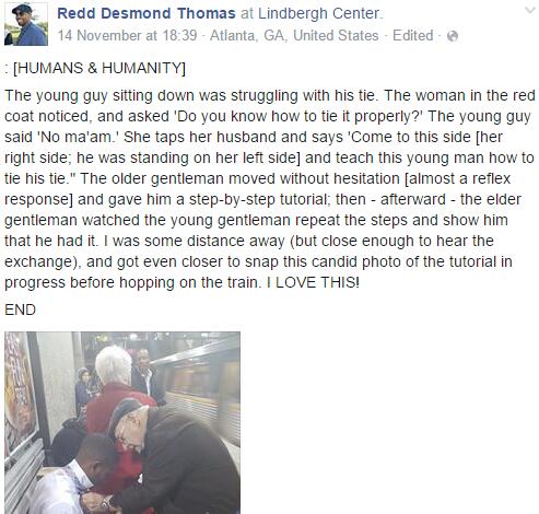 “这位小伙子正在那儿跟他的领带搏斗,穿红衣服的老妇人注意到了他,便问道:‘你知道怎么系领带吗?’小伙子说不知道。于是老妇人就让丈夫去帮帮那个小伙子。老爷爷不假思索就上前去手把手的教他,他示范了一遍,然后让小伙子自己系了一遍。我在上车前拍下了这张照片,超爱它!”