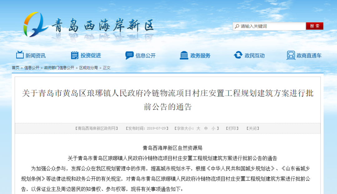 2019年7月,西海岸新区官方发布了黄岛区琅琊镇冷链物流项目村庄安置工程规划的公告。项目位于西海岸琅琊镇镇驻地内天城路以西、菊香街以北。东南侧为大皂户村址,北侧为胶南天成吉包装公司,东侧不远为皂户河,东北侧不远为琅琊公园,周边自然环境良好。建设用地面积8.0223公顷。