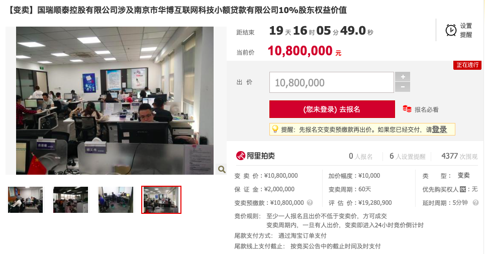 截至21日下午,阿里拍卖显示,国瑞顺泰控股有限公司(下称 “国瑞顺泰”)所持南京市华博互联网科技小额贷款有限公司(下称 “华博小贷”)10%的股权被北京市西城区人民法院变卖司法拍卖,变卖价格为1080万,变卖周期剩余不足20天。