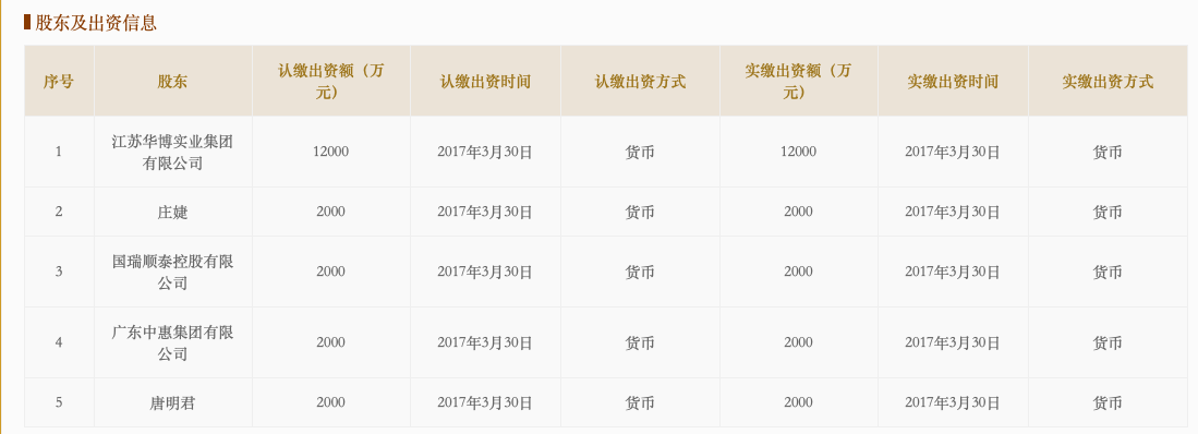 华博小贷在2016年12月12日获江苏省人民政府金融工作办公室批复筹建,由江苏华博实业集团有限公司(下称 “华博实业”)控股,其他股东包括国瑞顺泰、广东中惠集团及自然人庄婕和唐明君持股比例均为10%。两名自然人股东疑关联现金贷平台现金巴士。天眼查信息显示,庄婕为现金巴士监事,唐明君还参股保险盒子、原P2P竹子理财公司主体等。华博小贷的业务范围包括面向股东电子商务平台的成员和客户发放贷款、开展创业投资、提供融资性担保、代理金融机构业务及经省金融办批准的其他业务。(依法须经批准的项目,经相关部门批准后方可开展经营活动)