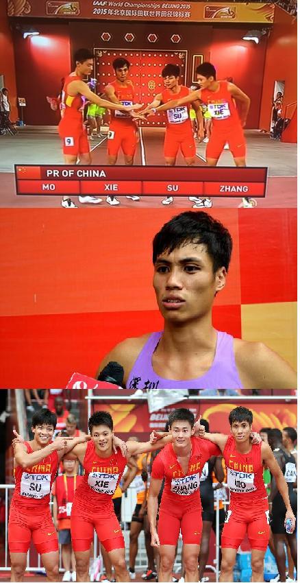 然而,这比起他在大赛中的表现,却保留了不少。对于中国观众最熟悉的短跑,莫过于8月在家门口的一场比赛。2015年8月29日,在北京田径世锦赛男子4×100米的飞人大战中,莫有雪、苏炳添、谢震业、张培萌代表中国队出战,以38.01秒摘银(美国队因犯规被取消成绩)。这场比赛之所以激动人心,是因为世界顶尖高手云集。博尔特领衔牙买加队、加特林代表的美国队,以及法国、日本、澳大利亚等强队均在其中。中国队能突出重围,取得如此好成绩,实在是鼓舞人心。这场比赛后,人们关注得最多的就是苏炳添、张培萌,然而很多人没有注意到的是,这枚银牌大战跑第一棒的,就是他:莫有雪。